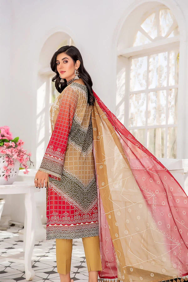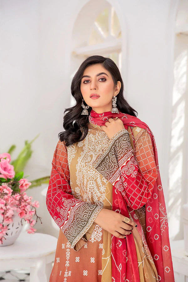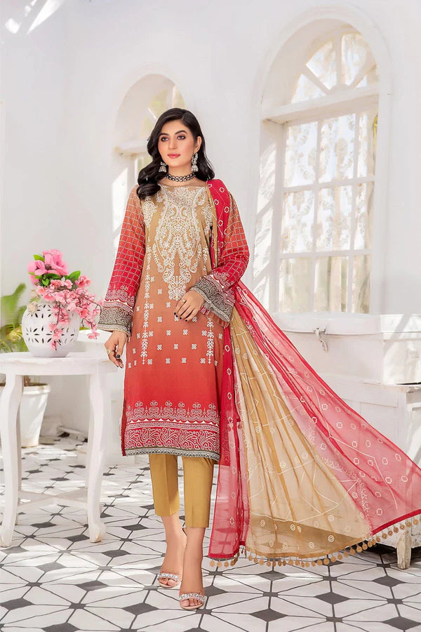 3pc Embroidered & Printed Lawn with Tie & Dye Embroidered Chiffon Dupatta & Plain Cotton Trouser.