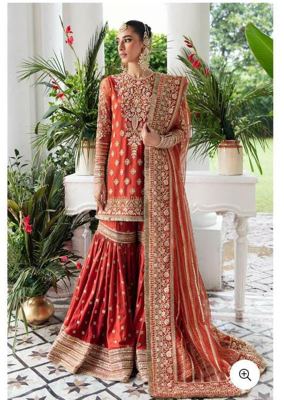 Elegant and traditional, the MILLI BLUSH Collection features a stunning red outfit with intricate gold embroidery. Paired with a matching dupatta and adorned with gold accents, this ensemble is perfect for special occasions. Crafted with attention to detail for a regal look."